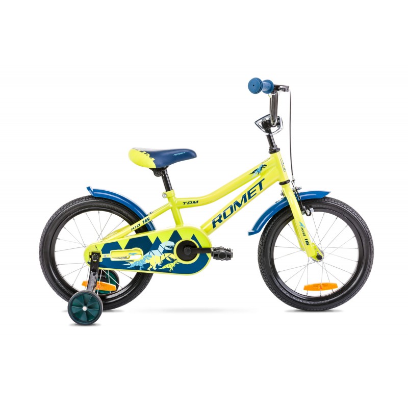 Rower dziecięcy Romet Tom 16 stalowy, jednobiegowy na kołach 16 cali z bocznymi kółkami do nauki jazdy. Atrakcyjny wygląd i pełne bezpieczeństwo dzięki hamulcom torpedo i szerokim oponom dającym stabilność.